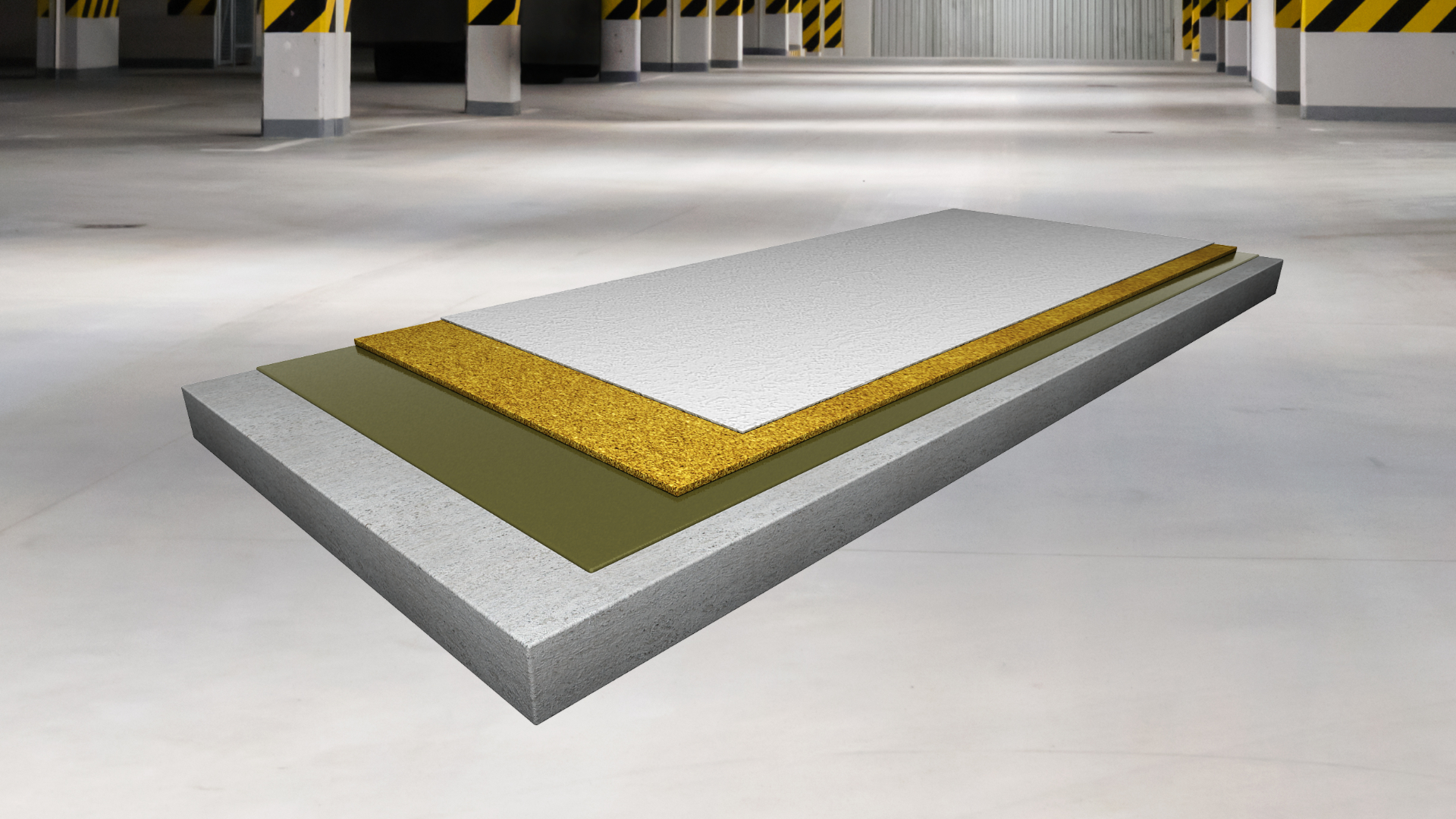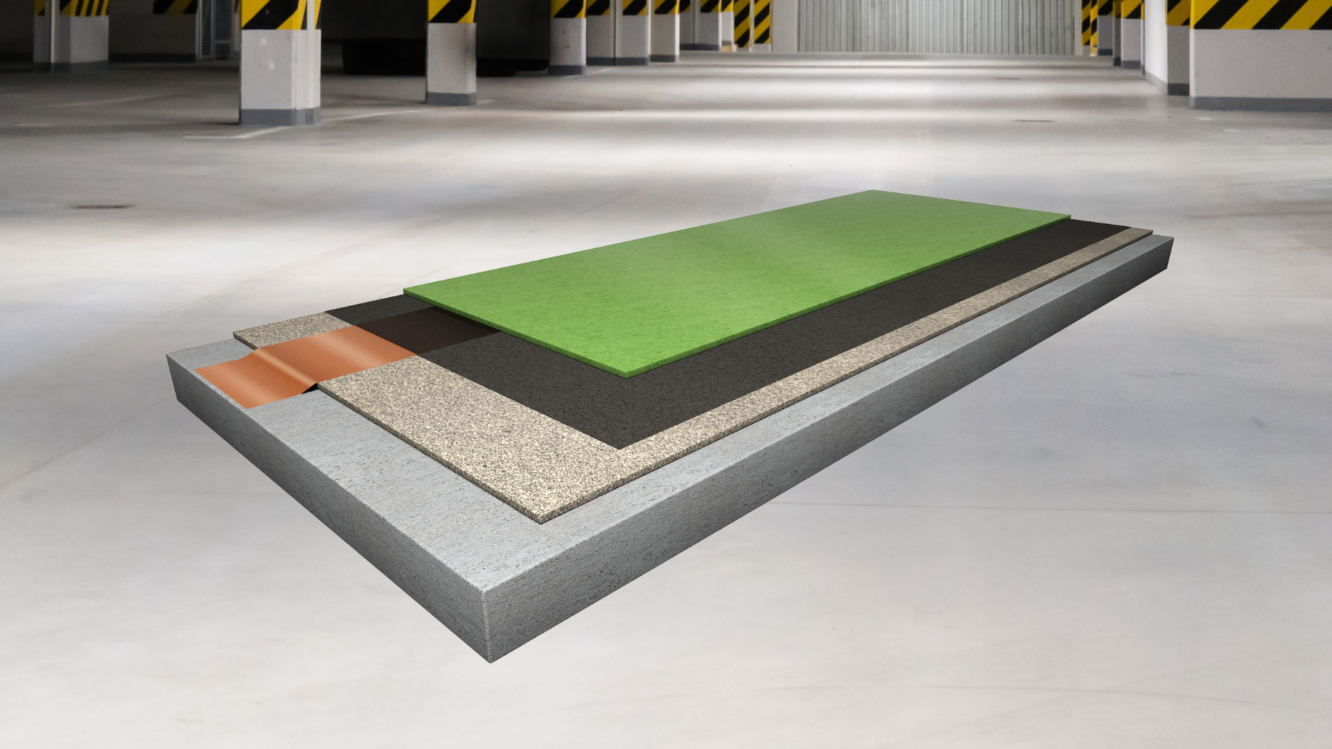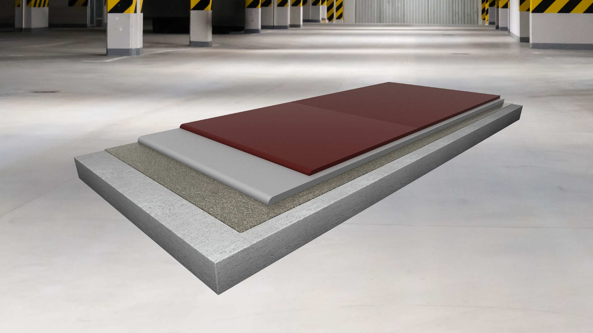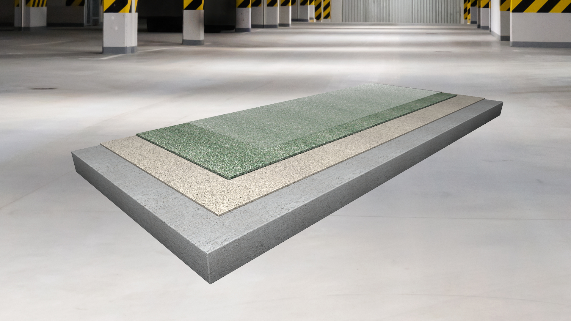 trvale pružná izolační polyuretanová, trhliny překlenující stěrková podlahovina s epoxidovou penetrační vrstvou, ´plovoucí´ elastickou mezivrstvou a finální pružnou vrstvou s křemenným plnivem, s jemně strukturním povrchem, tl. 3 – 4 mm, schopnost překlenutí dynamických trhlin do 0,5 mm i za minusových teplot (třída B 4.2) vhodná i pro exteriérové aplikace (např. pojížděné střechy)
